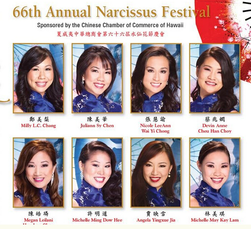 华裔人口在夏威夷州总人口中的比例非常高,华裔水仙花皇后选美活动已经连续举办了67届。如今已演变成当地最富中华文化特色的年度盛事,受到主流社会和各族裔人士的广泛关注。
