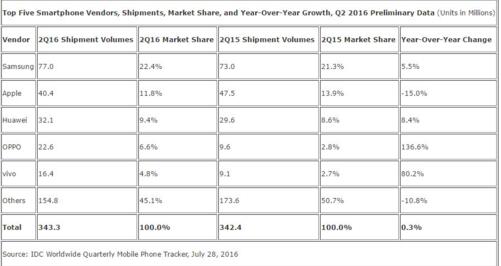 “除了三星在Galaxy S7旗艦機上大獲成功外,包括蘋果在內的大部分廠商都在更低價機型上取得了成功,”IDC手機團隊研究經理安東尼·斯卡塞拉(AnthonyScarsella)在聲明中稱,“隨著智能機價格繼續下滑,高端市場競爭加劇,廠商需要以更低售價推廣旗艦手機,鼓勵消費者更為頻繁地升級手機。華為、OPPO、Vivo以及小米等中國品牌已經在這一戰略上取得了成功,他們銷售的高端手機專注於對消費者最為重要的特性,例如成像、音質以及設計。”
