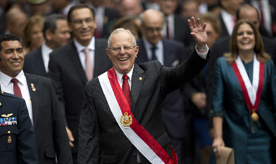 7月28日,在秘鲁首都利马,秘鲁当选总统库琴斯基(中)出席就职仪式后向众人挥手致意。