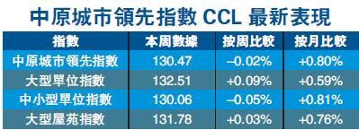 此外,據中原地產研究部高級聯席董事黃良昇介紹,中原城市領先指數(CCL)最新報130.47點,按周跌0.03%。有關指數主要根據今年7月18日至24日簽訂正式買賣合約的中原集團成交計算,反映6月24日英國脫歐公投后第三周的市況。