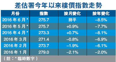 據差估署資料,本港樓價指數於去年9月高見306.1點,之后連月下跌。截至今年3月,指數累積回落11.3%至271.4點。今年4月份起指數出現反彈,以6月份數字計,較去年9月高位跌幅約9.9%。假如與去年6月數字比較,今年6月指數則錄8.5%跌幅。