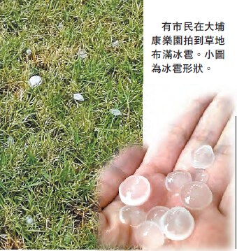 天文臺於昨日下午1時接到大埔有冰雹報告。有市民在大埔三育中學目睹落雹,約一個硬幣大小的冰粒,夾雜雨水從天而降,持續了2、3分鐘。林靜芝解釋,因為大氣不穩定,日間新界北部氣溫曾升到34度或以上,由於高溫激發強雷暴,對流活動旺盛,便形成冰雹。下午時分大埔因冰雹夾雜大雨,及下沉氣流影響,氣溫一度下跌10度,由攝氏34度跌至24度。她又稱,7月落冰雹不罕見,由1967年至今,總共錄得6次在7月落冰雹的報告,最近一次是在2008年。