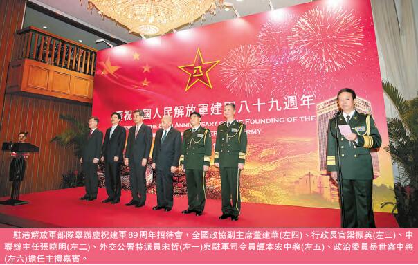 【香港商報网訊】解放軍駐港部隊昨晚在中環軍營舉辦招待會,慶祝中國人民解放軍建軍89周年。全國政協副主席董建華、行政長官梁振英、中聯辦主任張曉明、外交部駐港特派員公署特派員宋哲與解放軍駐港部隊司令員譚本宏、政委岳世鑫擔任此次招待會的主禮嘉賓。