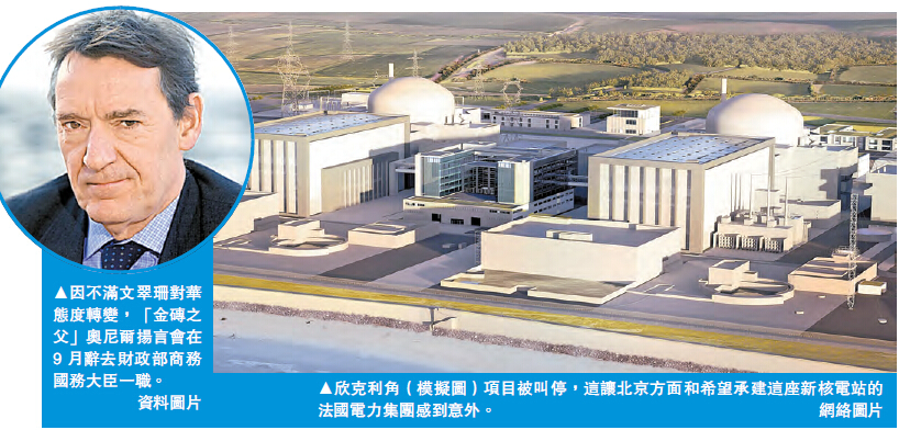 英國首相文翠珊在欣克利角核電項目上變卦,是否意味著前首相卡梅倫和前財相歐思邦打造的英中「黃金時代」出現變數?英國《金融時報》指出,有中國官員明確表示,如果欣克利角項目現在不能啟動,「黃金時代」開啟的機會渺茫。這項合作的失敗將會損害中國的雄心,受損範圍遠超項目本身。