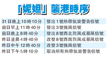 昨日凌晨5時20分,天文臺改發8號風球(西南)信號,並發出黃色暴雨警告信號,本港普遍地區出現暴雨及風力進一步加強。港鐵在凌晨6時許,一度宣布東鐵線受外物阻礙致列車服務受阻,直至下午1時後,地鐵服務始逐漸回復正常。其後輕鐵天悅站及三聖站附近又因強風吹倒大樹,令列車服務受阻約1小時。