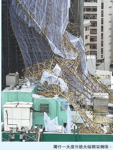 昨清晨6時許,觀塘繞道東行線近九龍麵粉廠對開1支位於路中分隔石壆上的燈柱,疑不堪陣風吹襲塌下,幸無打中途經車輛造成傷亡,惟上址快線及中線要臨時封閉。另外,灣仔譚臣道近菲林明道一大廈外牆,昨晨7時許有大幅棚架被強風吹翻,搖搖欲墜,部分壓落軒尼詩道一大廈天臺,警方將附近路面封閉。