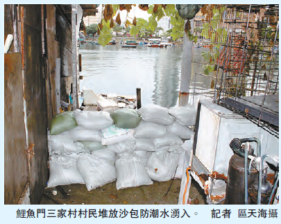 風暴襲港期間,正值天文大潮,沿岸多區昨午夜過後均出現海水暴漲半米至一米的天文現象,其中鯉魚門三家村及大嶼山大澳出現海水倒灌,村民預先堆放沙包防範。