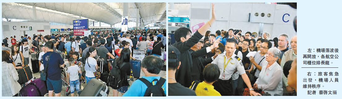 國泰及港龍航空表示,儘管兩家航空公司在香港國際機場的航班於昨午逐漸回復運作,惟因要疏導旅客,加上其他機場運作限制及航空交通繁忙,故昨天及今天的航班仍有取消或延誤的可能,呼籲未有確認機位的乘客切勿前往機場。國泰及港龍將豁免重新訂位、更改行程及取消行程所需的手續費,有關措施將適用於持有8月1日或之前由所有地區發出、並於8月1日至3日啟程的國泰或港龍經香港之機票(不分航票類別)。