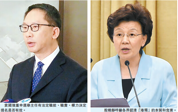 【香港商报网讯】记者周伟立报道:本土民主前线梁天琦未能入闸参选9月举行的立法会选举,对於社会上有质疑为何他2月时可参加立法会新界东补选、今次却被拒绝,律政司司长袁国强昨日重申,选举主任有法定职能、职责、权力决定提名是否有效;强调所有理据都有法律基础。中联办副主任殷晓静昨出席一个活动时亦表示,「港独」是大是大非问题,触犯了原则底线、损害国家主权安全和发展利益,呼吁各界认清「港独」本质和危害,「理直气壮、旗帜鲜明地反对港独」。