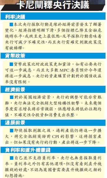英國央行貨幣政策委員會(MPC)當天全票通過減息決議,基準利率由0.5%下調25個基點至0.25%;并以6:3的投票比例決定在未來6個月內,將資產購買規模擴大600億英鎊(約合6113億港元)至4350億英鎊。央行同時指出,央行大部分委員預計年底前減息至接近零。