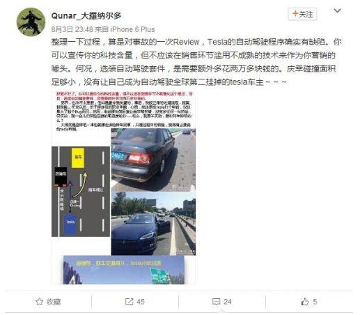 @Quner_大羅納爾多在微博總結稱:“Tesla的自動駕駛程序確實有缺陷。你可以宣傳你的科技含量,但不應該在銷售環節濫用不成熟的技術來作為你營銷的噱頭。何況,選裝自動駕駛套件,是需要額外多花兩萬多塊錢的。慶幸碰撞面積足夠小,沒有讓自己成為自動駕駛全球第二掛掉的tesla車主。”