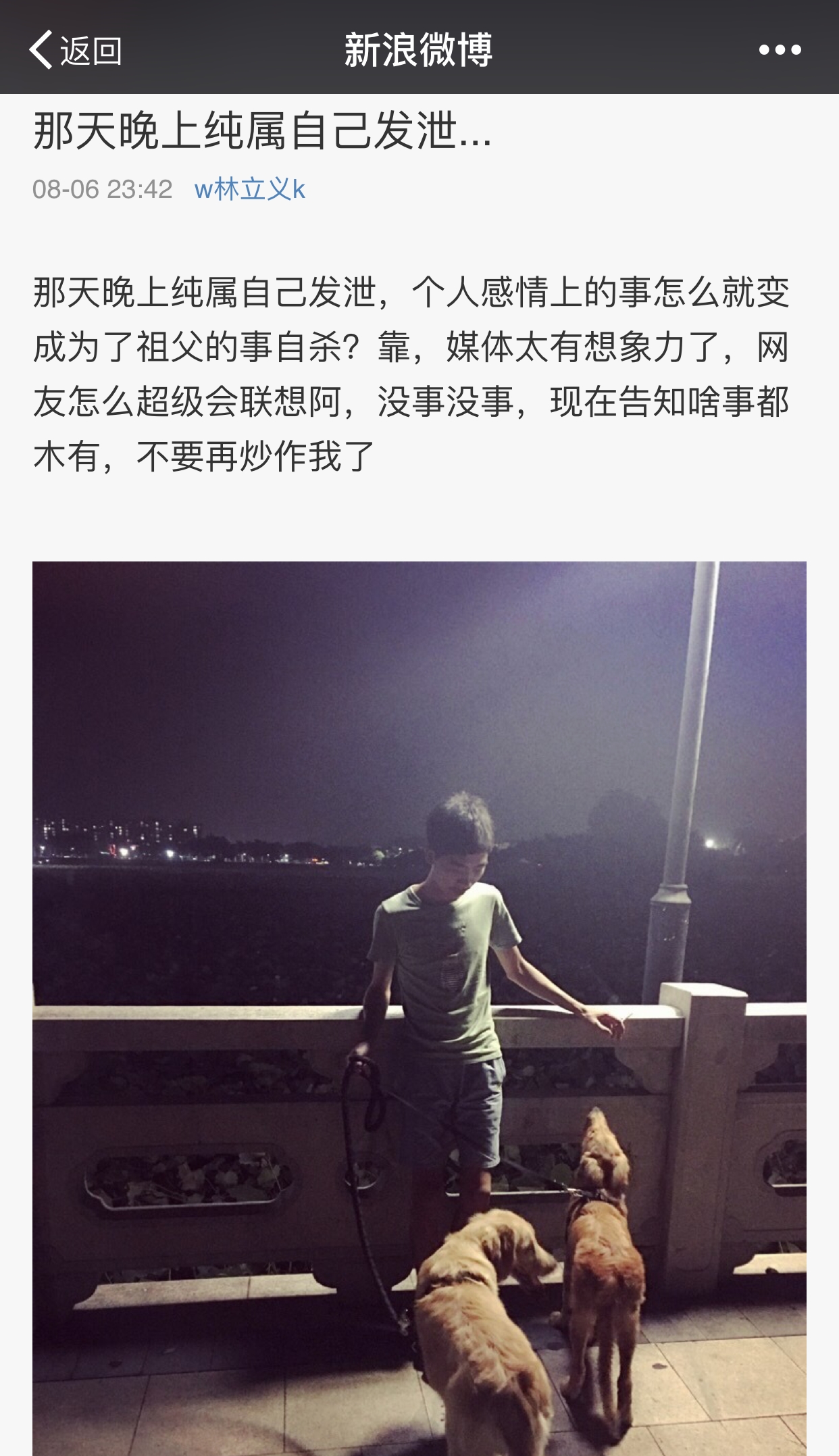 林立义明确表示,自己因为跟女朋友闹矛盾,喝了酒而做了傻事。"那天晚上纯属自己发泄,个人感情上的事怎么就变成为了祖父的事自杀?靠,媒体太有想象力了,网友怎么超级会联想阿,没事没事,现在告知啥事都木有,不要再炒作我了"。