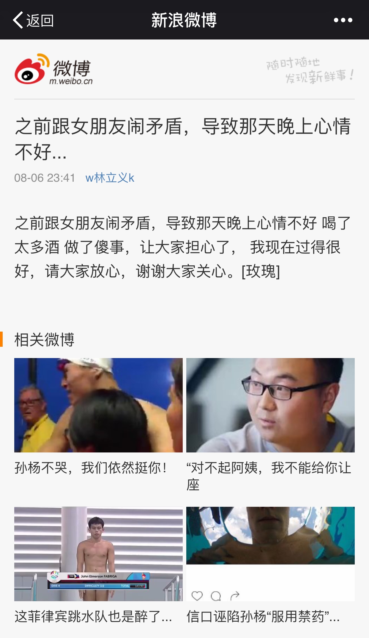 【香港商报网讯】8月6日,乌坎林祖恋的孙子林立义在其新浪微博发表博文,称自己那天的"自杀"直播纯属个人因感情上的事而发泄,和其祖父毫无关系,并讽刺某些媒体太有想象力。