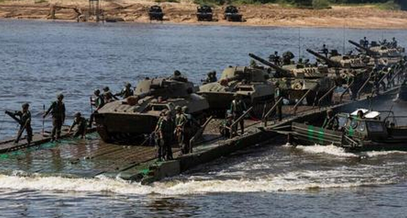 6日上午,中俄塞三国参赛队伍在奥卡河上比肩而列,同场竞速完成各项任务。比赛在铿锵有力的军乐中激烈进行,不断有军用直升机在低空飞过,为比赛增加实战感。参赛队伍使用浮动运输船,在300米宽的河面往返穿梭,将主战坦克、自行榴弹炮、步兵战车等重型装备按规定线路运送至对岸。