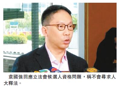 袁国强早上出发前往澳洲访问前时表示,候选人资格问题可以在本港司法系统处理,故不会要求人大常委释法。他指出,根据法例,选举主任有权力,而且有法律上的责任对候选人是否符合有效提名要求作出决定,故此「不是签了名就完全符合」。