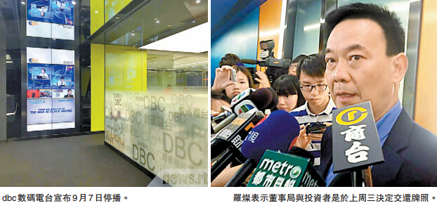 【香港商报网讯】记者周伟立报道:香港数码电台广播有限公司昨日向全体员工发信表示,公司对数码广播的经营和推广一直不遗余力,惟本港整体数码声音广播业发展步伐未如理想,特别是汽车接收一直未能普及,业务得不到足够的广告支持,经股东及董事局议决,决定向政府交回声音广播牌照,并将於本年9月7日停播旗下dbc数码电台所有频道,共113名员工受影响。