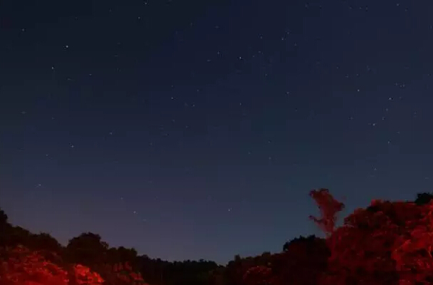 同道中人开车离开时识趣地没开大灯,但车尾的红灯却将山头染成红红一片。