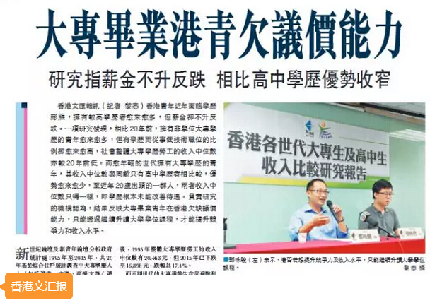 文汇报报道称,研究显示,愈年轻的世代拥有大专学历的青年,其收入中位数与同龄只有高中学历者相比较,优势愈来愈少,至近年20岁出头的一群人,两者收入中位数只得一样,即学历根本未能改善待遇,反映大专毕业青年在香港欠缺议价能力,只能透过继续升读大学学位课程,才能提升竞争力和收入水平。报道指,不同世代的大专毕业生在起薪点和上流速度,愈年轻愈趋下降。以第二代至第六代大专生在20岁至24岁时为例,第二代的大专毕业生收入中位数为12,141元,直至第五代下跌至约9779元,直至第六代才略为回升至10934元。