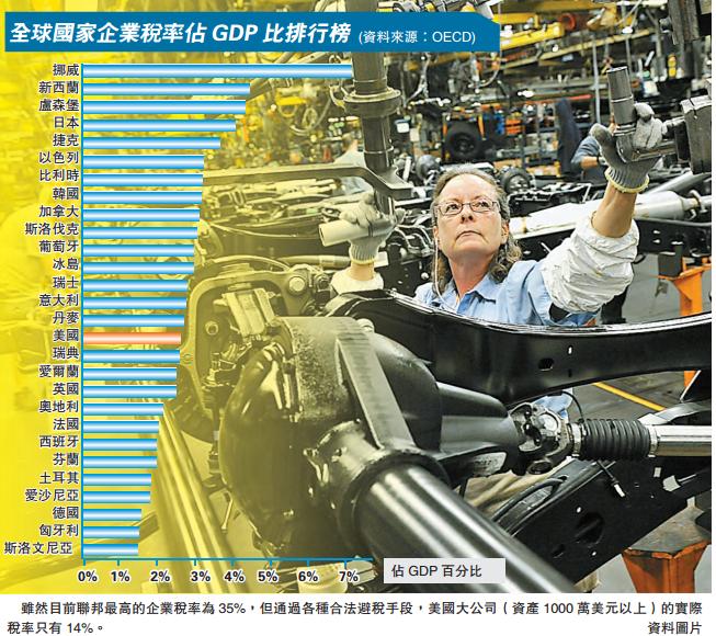 特朗普當天強調,該計劃最大的受益者是中低收入人群,同時此項計劃還將消除讓華爾街投資者享有特殊利益的稅收漏洞。他更指出,相比目前計劃,他的方案反而令富裕階層個稅稅率有所提升,并有助降低赤字增速,同時讓美國在吸引外資時更有吸引力。雖然目前聯邦最高的企業稅率為35%,但通過各種合法避稅手段,大公司(資產1000萬美元以上)的實際稅率只有14%。美國企業稅占GDP的比重,在經合組織(OECD)國家中排名已屬中等偏下。