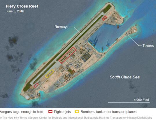 【環球網報道記者王一】美國《紐約時報》當地時間8月8日報道,美國智庫“戰略與國際研究中心(CSIS)”稱,7月最新衛星圖片顯示,中國已在南海三座島礁建成飛機庫。該智庫還據此臆測,中國或將在南海推進“軍事化”,因為這些飛機庫都達到了軍用規格,可以停放任何型號的軍機。