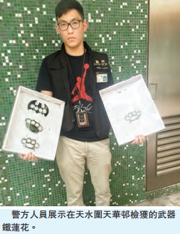 元朗警區反三合會行動組人員早前接獲線報,指有人在寓所內藏有違禁武器,經深入調查及蒐證後,鎖定1名目標青年,至昨午1時許,探員展開代號「雷霆一六」行動,突擊搜查天水圍天華華祐樓一目標單位。探員成功入屋後進行搜查,在單位內檢獲5個鐵蓮花的違禁武器,遂以涉嫌管有違禁武器罪名,拘捕在單位內的姓趙青年(21歲),連同證物一併帶署扣查,據悉被捕青年有黑幫背景,警方正調查他藏有鐵蓮花的目的。
