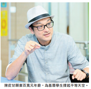 陈荭表示,他在交接工作时,每周五深夜都会接触「边缘学生」,逐渐摸索出「一对一」的补习模式。当正式离任後,他随即注册慈善机构,并於5年前创办「陈校长免费补习天地」。从高薪厚职到零收入,离不开家人的支持。陈荭的太太原是海关督察,夫妻两人月薪约15万元,创办免费补习天地後,陈荭决定不支取薪水,仅靠撰写专栏和做讲座,每月赚取几千元,一家五口全靠太太每月4、5万元工资生活。