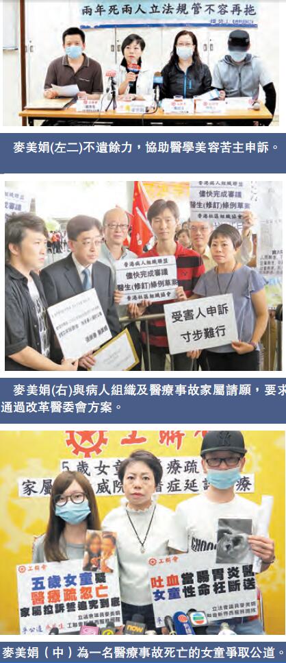 除了医学美容事故,医疗事故亦是麦议员一直跟进的问题,在多个麦美娟协助的医疗事故个案当中,都经历十分漫长的医委会审讯过程,令病人以及家属需要花很长时间来讨回公道。当遇上医疗事故求助个案,麦议员会协助受害人或家属寻找不同政府部门,并申请医疗纪录、处理相关信件等工作,所以事件令她发现普通市民要寻求公道,甚至挑战医疗制度都是困难重重,亦令她更希望帮助市民找回公道。