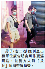 【香港商报网讯】记者万家成报道:「胆大包天」男房东,早前够胆在报章刊登招租广告,声称有两个单位可用作卖淫用途,警方获悉後展开深入调查,并於前晚派员乔装租客「放蛇」,相约有关房东签租约时表露身份,当场将涉嫌依靠他人卖淫维生的男房东拘捕带署扣查。