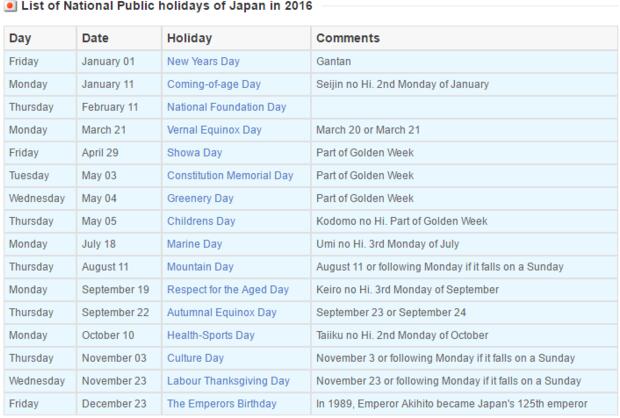 在全球主要國家中,日本已是全國節日最多的國家。加上新發明的“登山節”,全年共有16個公共假期,基本上每個月都放假。放假由頭也五花八門,如敬老日和綠之日等。這與日本人工作辛苦的傳統印象“大相徑庭”。