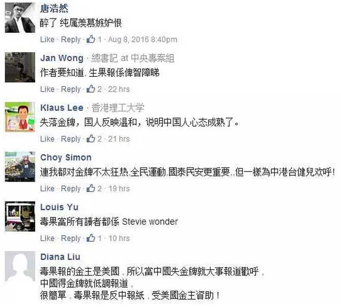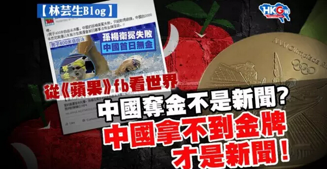 全知万能的FB大神告诉我们,原来在中国香港的《苹果》眼中,中国夺金似乎不是新闻,中国拿不到金牌才是值得大肆报道的喜事。据说,这份报章读者不少,或许这就是一些香港人“坐井观天”把中国看得很怪诞的主要原因吧?