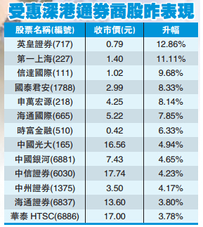昨日,证券股几乎全线上升,成交金额最多的是中国银河(6881),成交金额达6.36亿元,成为第15大成交股份,报7.43元,升幅4.6%;其次是海通证券(6837),成交金额达6.08亿元,位列第17大成交股份,升幅3.8%;中信证券(6030)全日亦大涨4.2%,收报17.46元;华泰六八八六(6886)收升3.7%,报17元。