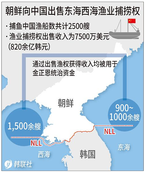 近日有900-1000艘中国渔船在东部海域北方界线附近捕捞,经分析证实中方已从朝方收购渔业捕捞权。获准在朝方海域捕捞的中国渔船有2500多艘,中方以820亿韩元(约合7500万美元)的价格购买了渔权。远远超过了此前7月1日韩国国情院向国会情报委报告的规模。