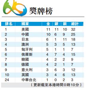 獎牌榜上,中國隊以10金5銀8銅繼續穩坐第二,美國隊11金11銀10銅佔據頭名。