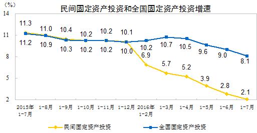 【香港商报网讯】据国家统计局网站今天公布的数据,2016年1-7月份,中国民間固定資產投資191495億元,同比名義增長2.1%,增速比1-6月份回落0.7個百分點。民間固定資產投資占全國固定資產投資(不含農戶)的比重為61.4%,比去年同期降低3.6個百分點。