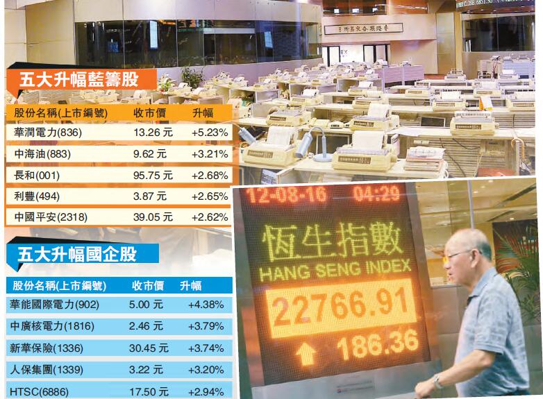 大型蓝筹股普遍上升,汇控(005)继续在伦敦回购股份,收市升0.55%;中移动(941)中期业绩好过市场预期,股价升至99元收市,升2.4%,成为升市主力。