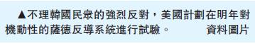 【香港商报综合报道】美国国防部导弹防御局局长叙林11日对韩国首尔进行访问时宣布,美国计划在明年对机动性的萨德反导系统进行试验,声称目的是能够用於拦截来自朝鲜的弹道导弹。他强调,萨德系统拦截率为100%,但将部署到韩国的萨德系统并不会被纳入美国的导弹防御系统,且不会针对中国。分析称,叙林的表态否认了外界有关与日本分享萨德雷达系统所获情报的观点。
