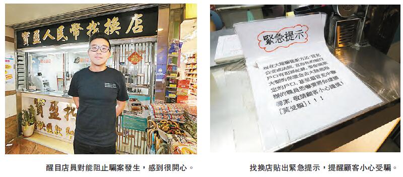 至昨午2时许,周婆婆由丈夫及年幼的孙儿陪同下,第3次到兑换店汇款,由於她多次汇款,且神情焦急,遂引起男店员注意,主动询问她汇款原因,并怀疑婆婆受骗,提醒应联络儿子,惟电话未能接通。男店员遂致电内地户口的联络人查问,讵料对方只叫他尽快汇款,幸随後婆婆终联络到儿子,并证实儿子安全,相信自己被骗,无奈报警求助,秀茂坪警区刑事调查队第8队接手案件列作「诈骗」案跟进。据悉,醒目男店员姓周,他表示是首次撞破电话骗案,对於能帮到人及时阻止骗案发生,感到很开心。