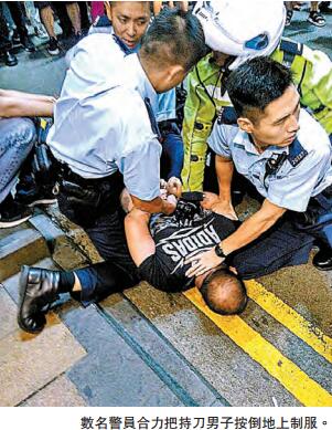 【香港商報网訊】記者馮仁樂報道:中環蘭桂坊前晚有醉漢情緒激動,闖入鏞記酒家搶來斬鵝刀在街頭揮舞,數名警員趕抵勸止不果與其對峙。兩名警員一度拔槍戒備,其中一名交通勇警趁其不備從後撲上,「空手入白刃」奪刀,同袍與好市民合10人之力將其制服,3名警員及一名市民受傷送院。