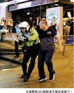 豈料醉漢情緒異常激動,與警員對峙,雙方距離約3米,氣氛一度非常緊張。兩名警員拔槍喝止,一名交通警員擔心傷及途人,趁醉漢不備奮不顧身從後撲上,隨即雙手握其利刀,附近同袍與好市民見機不可失,一湧而上,合10人之力將醉漢制服。警員馬上將利刀踢開,並將醉漢拘捕,事後將其拘捕帶署,受傷警員及市民則送院治理。