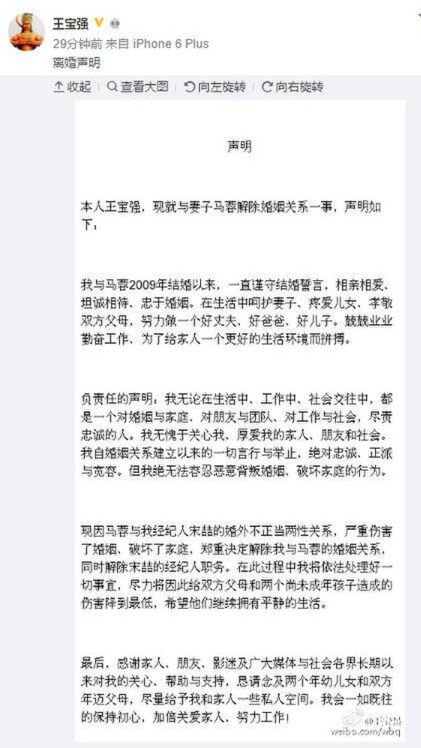 文中,王寶強說,自己無論在生活中、工作中、社會交往中,都是一個對婚姻與家庭、對朋友與團隊、對工作與社會,盡責忠誠的人。提到離婚原因,他透露,“(妻子)馬蓉與我經紀人宋喆的婚外不正當兩性關系”。