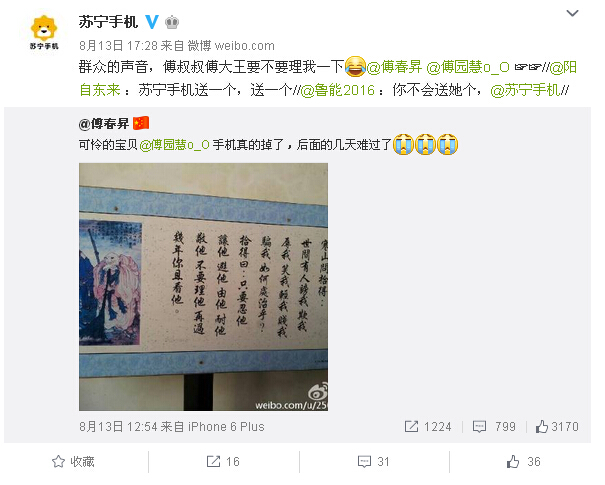 蘇寧手機也發布了一條官方微博:“上群眾的聲音,傅叔叔傅大王要不要理我一下。”最后,甚至還有微博大V以個人身份自愿給傅園慧送手機。