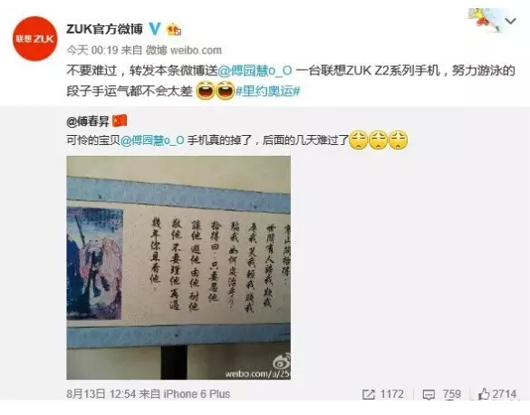 國產手機廠商ZUK則稱:“不要難過,轉發本條微博送@傅園慧o_O 一臺聯想ZUK Z2系列手機,努力游泳的段子手運氣都不會太差”。