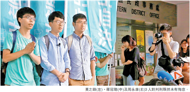 【香港商報網訊】前學民思潮及學聯頭目3人,於前年9月26日晚發起「重奪公民廣場」行動,攀爬圍欄及呼籲集會人士擅闖已封閉的政府總部東翼廣場,也引起往後更激烈的政治事件,開啟違法「佔領行動」的序幕。案件昨在東區法院判刑,時任學聯常委的羅冠聰因「煽惑他人參與非法集會」罪成,被判120小時社會服務令;時任學民思潮召集人的黃之鋒則「參與非法集會」罪成,被判80小時社會服務令;同樣「參與非法集會」罪成的學聯前秘書長周永康,因為要到英國升讀碩士,難以遵守社會服務令,被判監3星期、緩刑1年。3人均表示,會考慮就定罪提出上訴。律政司表示,會研究裁判官的判刑理據和主控官的報告,再決定是否需要跟進。3人並無悔意,揚言「繼續抗爭」。