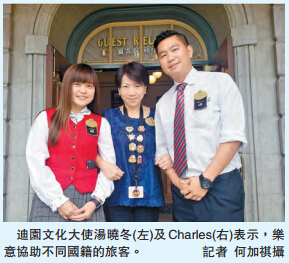 香港迪士尼乐园於去年12月正式推出「文化大使计划」,让懂得不同语言的员工兼任「文化大使」,用不同语言为来自世界各地的旅客解答查询。乐园宾客服务及乐园正门经理顾剑音表示,计划是希望让旅客来到乐园时,听到自己熟悉的语言後会感到更贴心、有一种「Wow」的感觉,可以让他们放心查询问题。