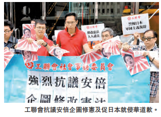 工联会10多名成员就抗议日本企图修改和平宪法,认为有机会引发战争,他们撕毁印有日本首相安倍晋三肖像的图片;神州青年服务社和全球华人保钓大联盟就要求日本面对历史,道歉及赔偿,并放弃侵占钓鱼台。
