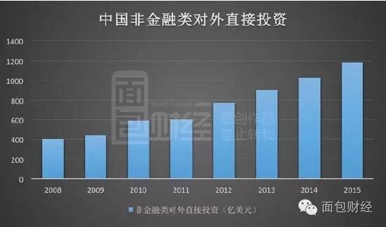 據商務部最新數據顯示:2016年上半年,中國非金融類對外直接投資金額為888.6億元,同比增長58.67%,創下歷史新高。從2008年到2015年,中國對外直接投資翻了近兩倍,已經成為全球最主要資本輸出國。下圖是面包財經根據官方數據繪制的中國近年來對外投資金額: