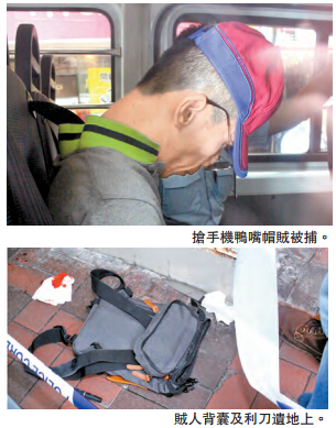 【香港商报网讯】记者区天海报道:一名暗藏利刀中年匪徒,昨午闯进油麻地佐敦道一间电讯公司抢去两部iPhone 6s手机,一对男女店员见状追出,与匪纠缠,期间匪徒从背囊拔出利刀斩伤女店员额头,男店员颈项同受伤,两名休班警员途经上前合力将其制服,两受伤店员幸无大碍。
