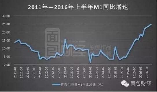 過去兩年六次降準降息,巨量的資金堆積在金融系統內。貨幣膨脹的節奏與地王涌現,萬科股權之爭開打、恒大啟動爆買模式也是驚人的“神同步”。下圖是面包財經根據官方數據繪制的近年M1走勢圖: