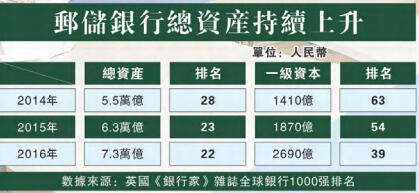 在英國《銀行家》雜誌「2016年全球銀行1000強排名」評選中,中國郵政儲蓄銀行按總資產排名位居第22位、按一級資本排名位居第39位。