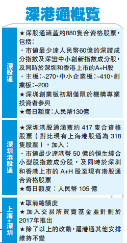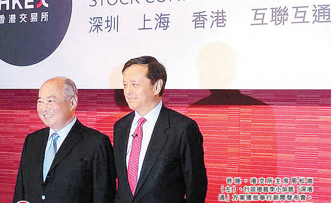 昨晚9时,港交所行政总裁李小加於记者会进一步谈到深港通详情。他指,深港通将加入800多只深圳股票、深圳创业板和ETF买卖,加上深港通和沪港通总额度取消,表明香港、深圳和上海交易所完成二级市场股票互联互通,是中国股票市场的一个里程碑,「今年是质的变化,往后会集中量的改进,不断完善制度」。